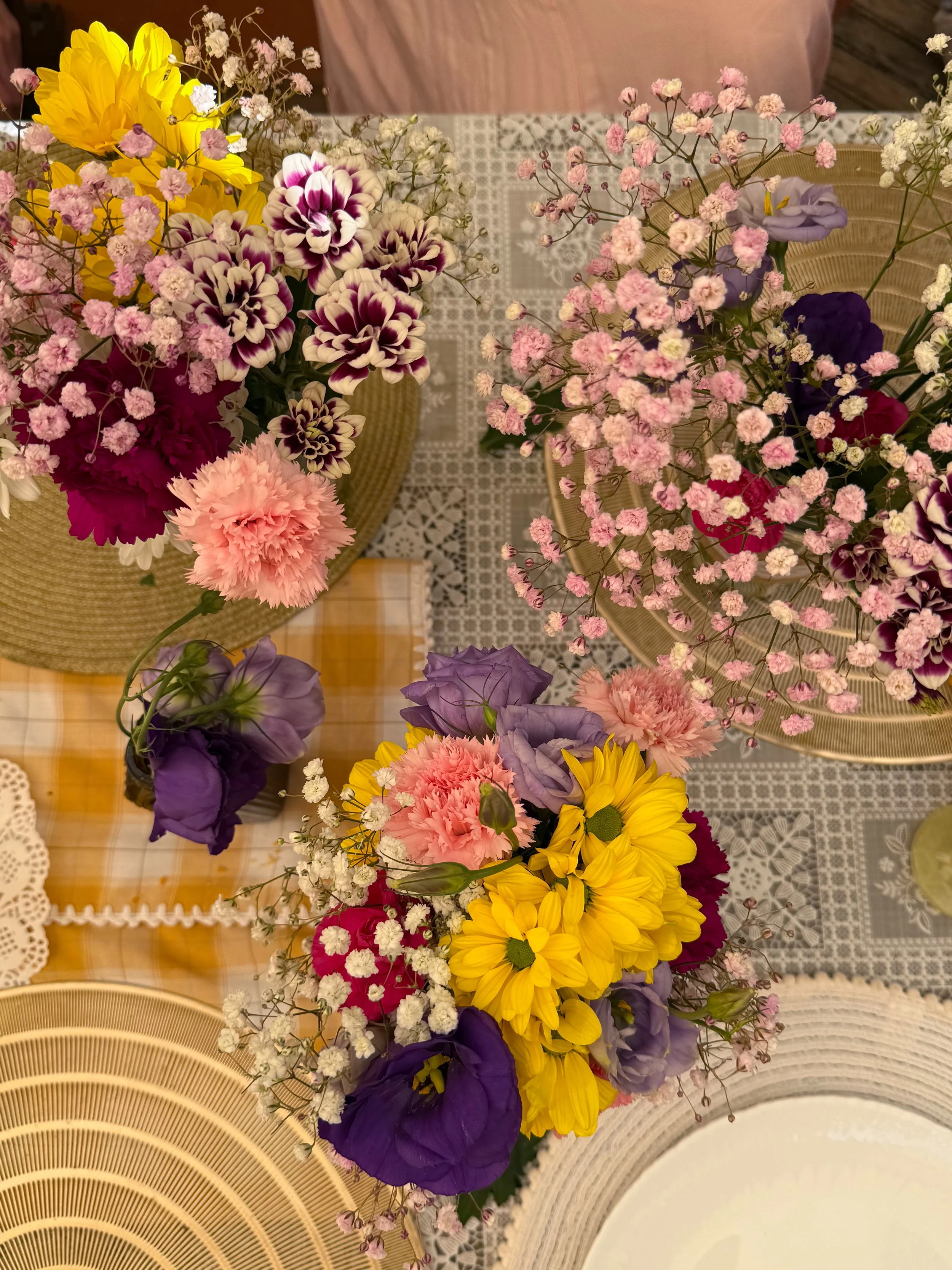 After three days of planning and prepping, the event officially started around 1:00 PM. About 12 of my friends came over for an afternoon of eating and bouquet building. Everyone brought 1–2 bunches of flowers, which made the most colorful bouquets you could imagine. That was kind of the whole point of this activity. Instead of spending way too much money on 10+ different flower types or buying a premade arrangement, we made our own mix, which was just so special.